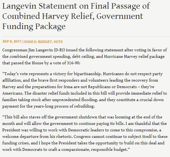 Pleased to support today’s #Harvey relief bill that will also prevent a government shutdown later this month.pic.twitter.com/XHcP1YOdFP