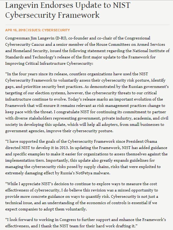 Congratulations @NISTcyber on the release of #cyberframework v 1.1. The cyber threat landscape is always changing, and it’s great to see this valuable risk guidance document evolving as well.pic.twitter.com/RYJY10QR6D