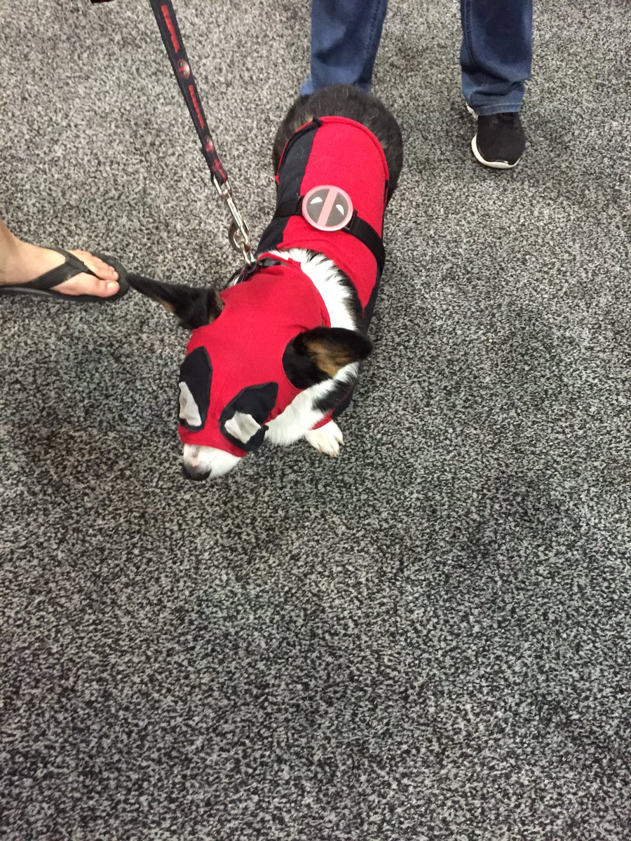 Deadpool doggie cosplay #WonderCon @deadpoolmoviepic.twitter.com/rZHG4xImys