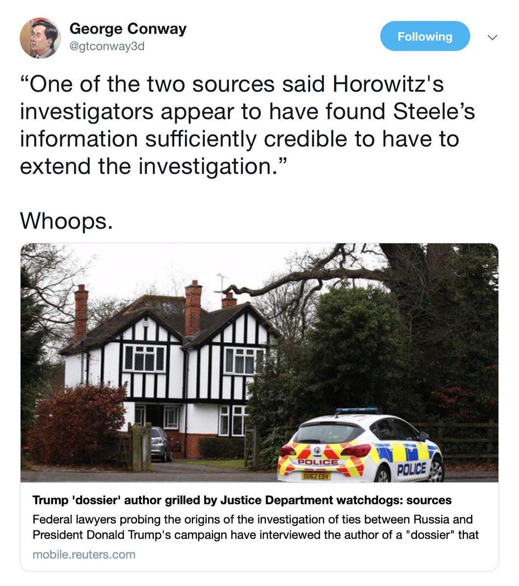 Justice Dept Inspector General Horowitz looking into Russia probe origins interviewed Steele in June. “Horowitz’s investigators appear to have found Steele’s information sufficiently credible to have to extend the investigation”