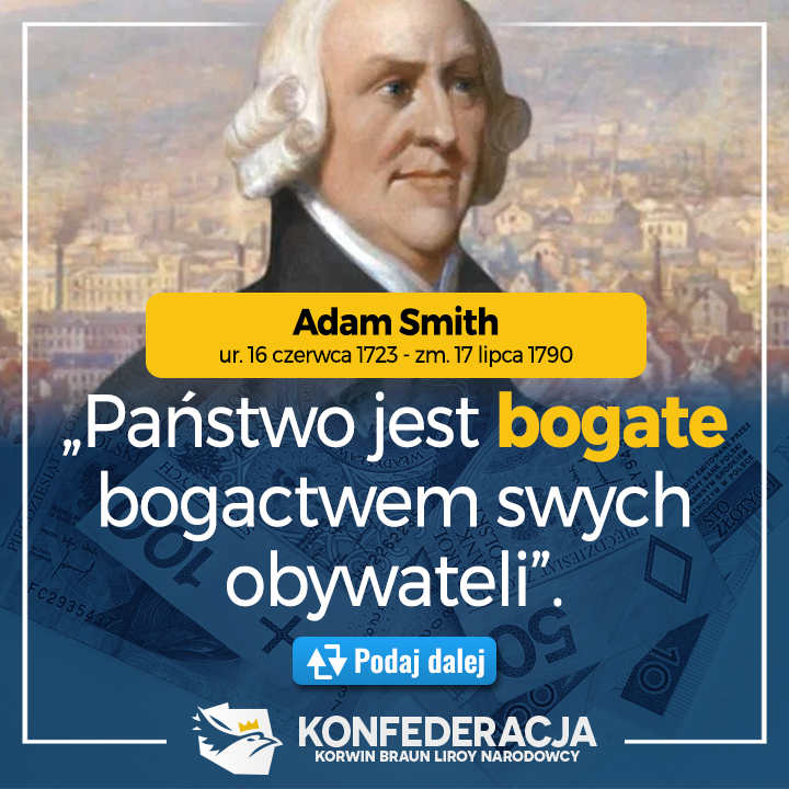 16-VI 1723r. ur. się Adam Smith – szkocki myśliciel i filozof, autor Badań nad naturą i przyczynami bogactwa narodów. Powtarzam, im mniej pieniędzy w budżecie tym lepiej dla Polski, więcej zostanie w naszych kieszeniach, a my wydamy je zawsze lepiej niż państwowy urzędnik!pic.twitter.com/9BDlEDZeql
