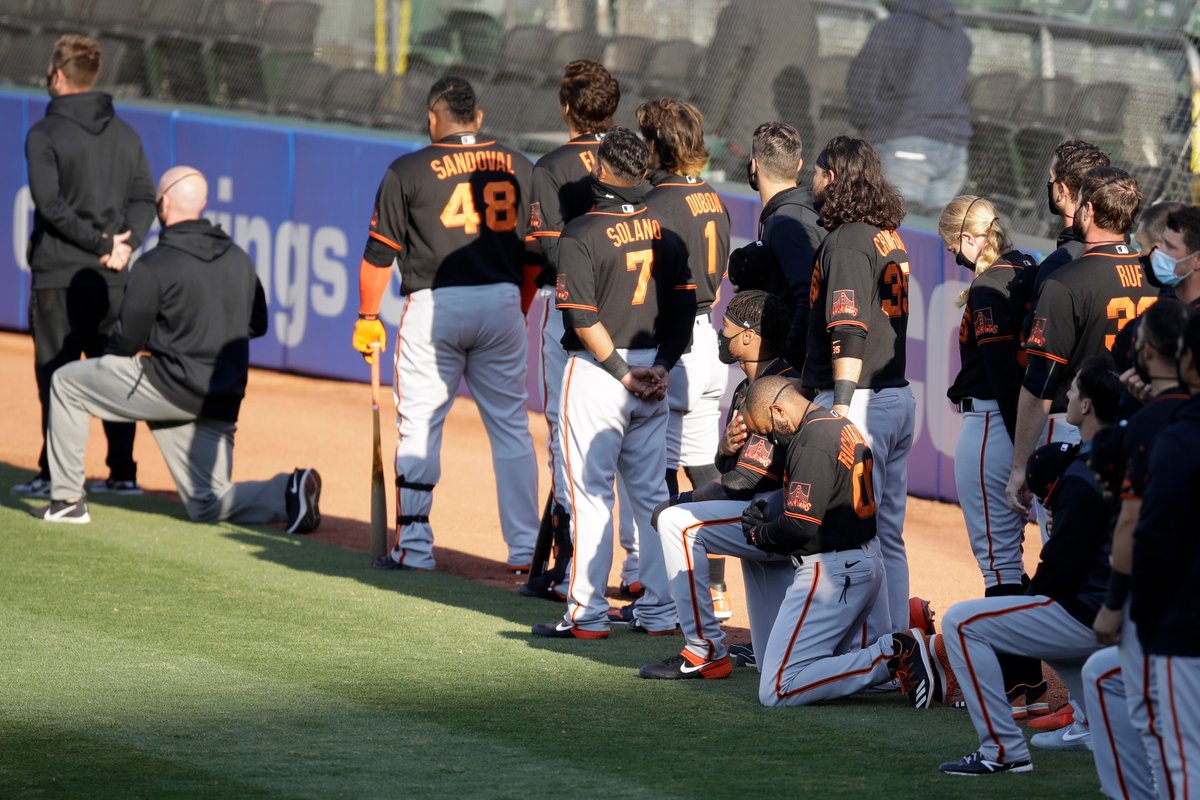 Members of the @SFGiants kneel during the National Anthem. #BlackLivesMatter pic.twitter.com/QbvAvCZiEs