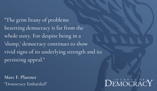 “Democracy Embattled” writes Marc F. Plattner, "reflects our sense that we are in the early stages of what is likely to be a long struggle. Democracy may be down, but it certainly is not out." https://muse.jhu.edu/article/745949
