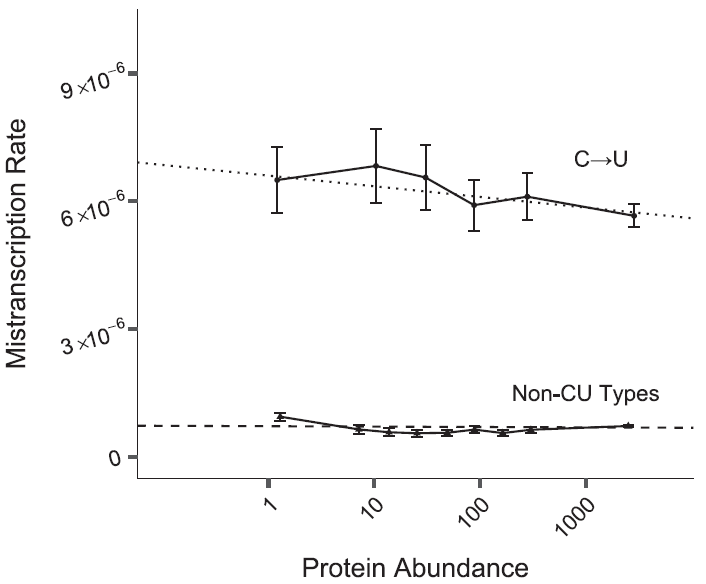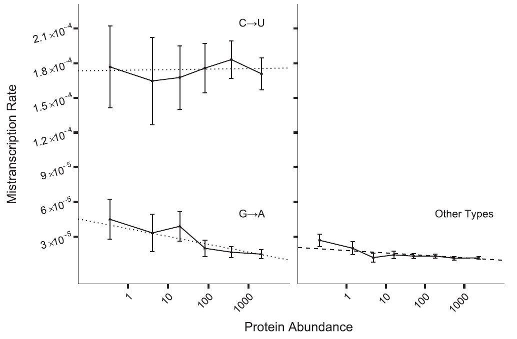 The E. coli relationship was steeper for G->A mistranscription events. It was non-existent for C->U because too much deamination happened during sample prep rather than biologically.pic.twitter.com/MPS5RwK3Fp
