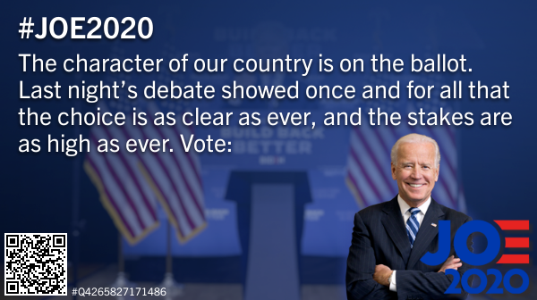 The character of our country is on the ballot. Last night’s debate showed once and for all that the choice is as clear as ever, and the #Joe #JOE2020 #BidenHarris2020 #BuildBackBetter #Anonymous #HiveMind #TheGame23 #TG23 #PM2020 #TYLERpic.twitter.com/1IdPQEjRyf