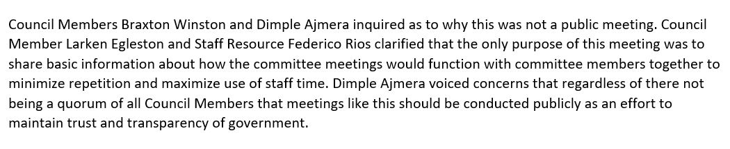 Sources say Councilmembers Julie Eiselt and Tariq Bokhari tried to attend the meeting but were told they could not because then there would be quorum.