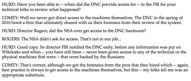Much media debunking of Trump DNC server comments. Politifact says 'False'; Politico says 'unmoored from reality.' But DNC did not, in fact, turn over server(s), no? Maybe that's unimportant; yes, there's other evidence. But did DNC hand over servers or not? From Comey 3/20/17:pic.twitter.com/X04ZhmUNsb