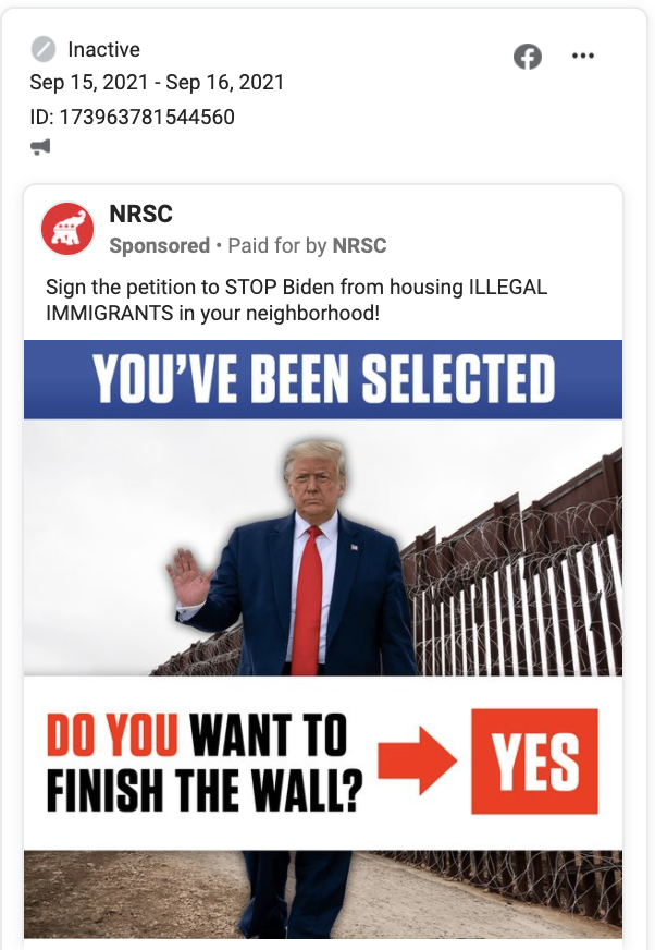 The NRSC, lead by Sen. Rick Scott (FL) continues to run Fbook ads with a message reminiscent of jim-crow area racial covenants warning of an alleged Biden effort set on “housing ILLEGAL IMMIGRANTS in your neighborhood” They delivered this message over 2.1M times yesterday.pic.twitter.com/fTt93CUhoD