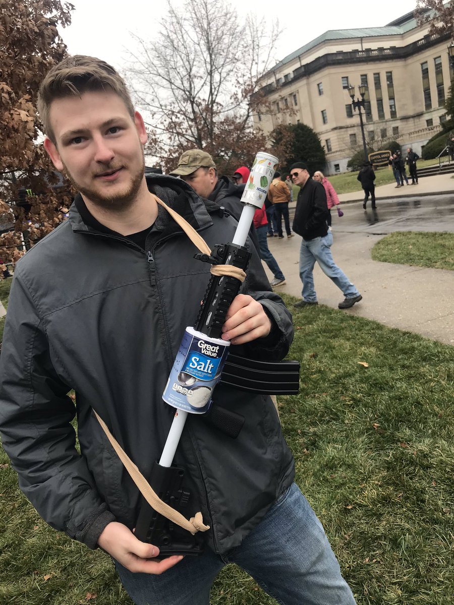 Devin Mathison, of Lancaster, KY., shows off his “a-salt” rifle at today’s gun rally in Frankfort. He’s also packing a 9mm in his waistband.pic.twitter.com/7yNFogf1qA
