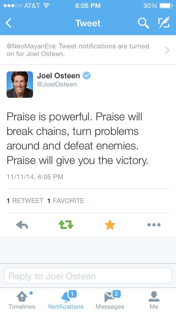 @JoelOsteen: Praise is powerful. Praise will break chains, turn problems around and defeat enemies. Praise will give you the victory.” TRUEThanks. Twitter will use this to make your timeline better. UndoUndo