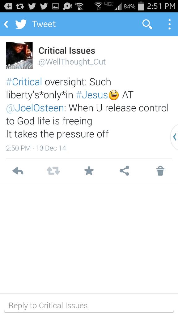 @JoelOsteen: When you release control to God, life gets much more freeing. It takes the pressure off.”Thanks. Twitter will use this to make your timeline better. UndoUndo