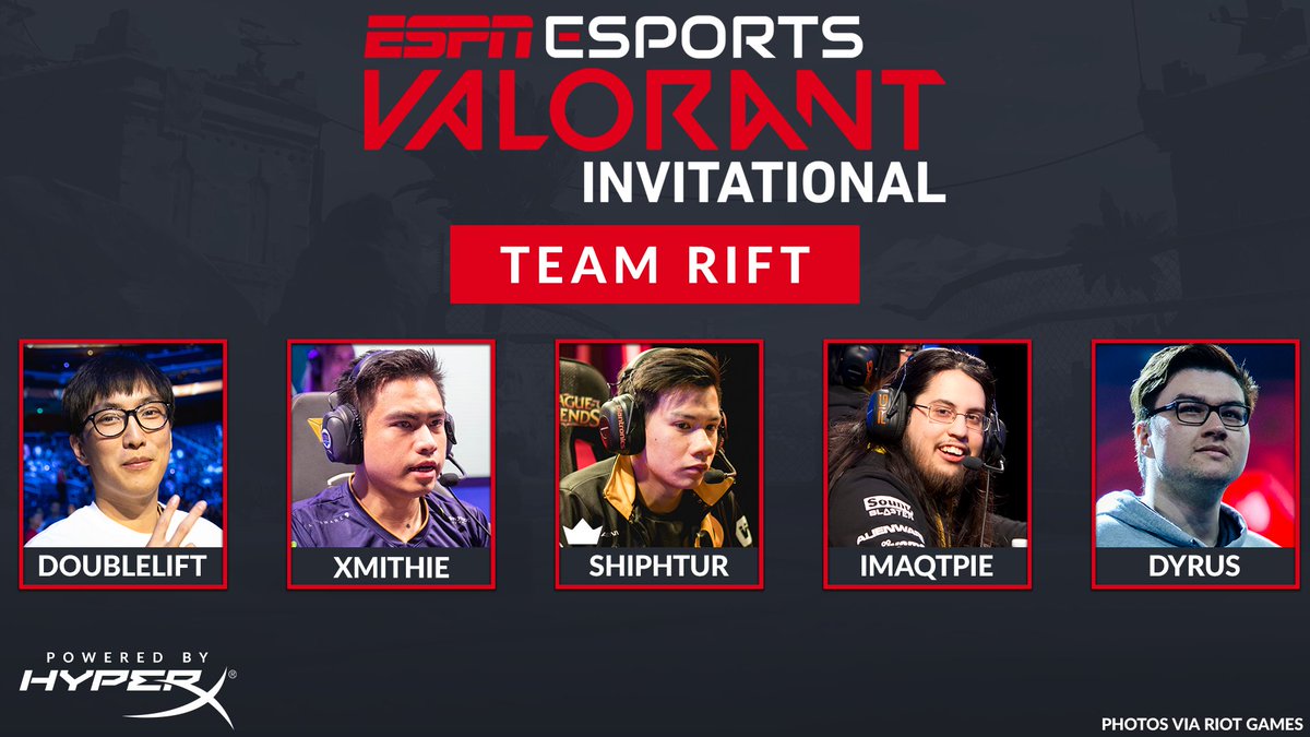 It looks like Xmithie and Doublelift are reuniting... but not where you think. Welcome Team Rift to the ESPN Esports @playVALORANT Invitational! Captained by @Shiphtur, @TLDoublelift, @Xmithie, @imaqtpie and @Dyrus. April 20-22 3 P.M. ET | 12 P.M. PT | http://twitch.tv/espnesports  pic.twitter.com/QdjzK4Sdgd