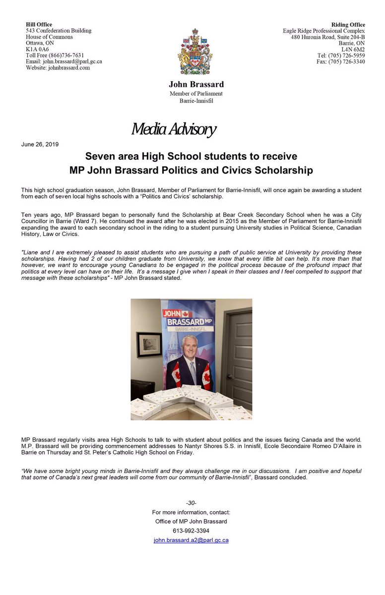 Media Advisory: Seven area High School students to receive M.P. John Brassard Politics and Civics Scholarship again this year.