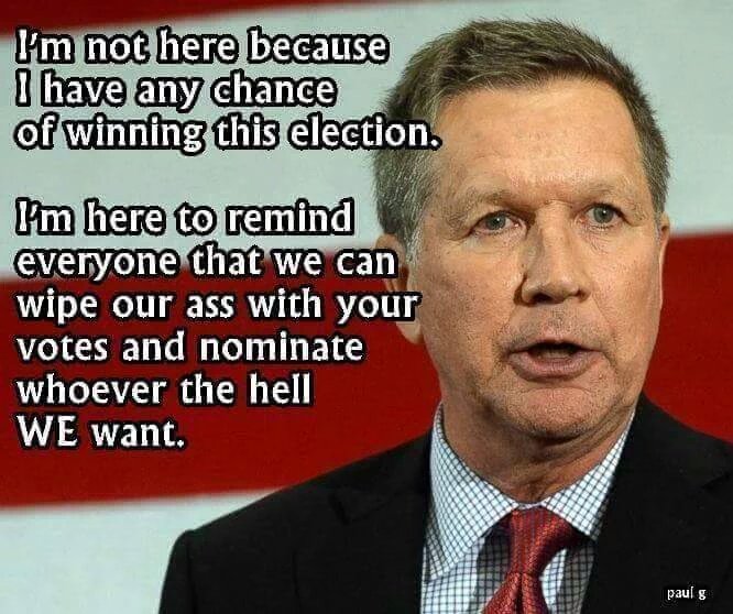 @JohnKasich Yeah...JUST what we need...ANOTHER lyin' dirtbag who's only in it for himself. Can't even move to the left for a Trooper...cont
