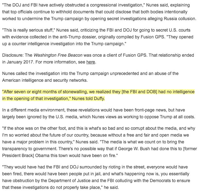 If what Devin Nunes alleges here proves true, this really says it all about the double standard of justice in this country and the evisceration of our institutions by their own unethical and lawless acts http://freebeacon.com/national-security/intel-chair-fbi-doj-obstructing-trump-probe-hope-dem-takeover-congress/ …pic.twitter.com/eO2DSCg3so