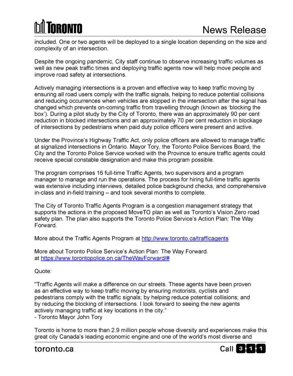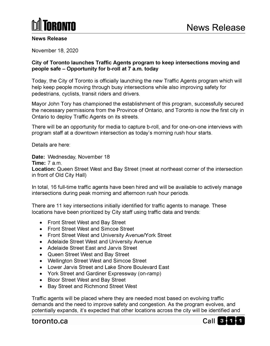 Today, the City of Toronto is officially launching the new Traffic Agents program which will help keep people moving through busy intersections while also improving safety for pedestrians, cyclists, transit riders and drivers.pic.twitter.com/kGFiF5YSr9