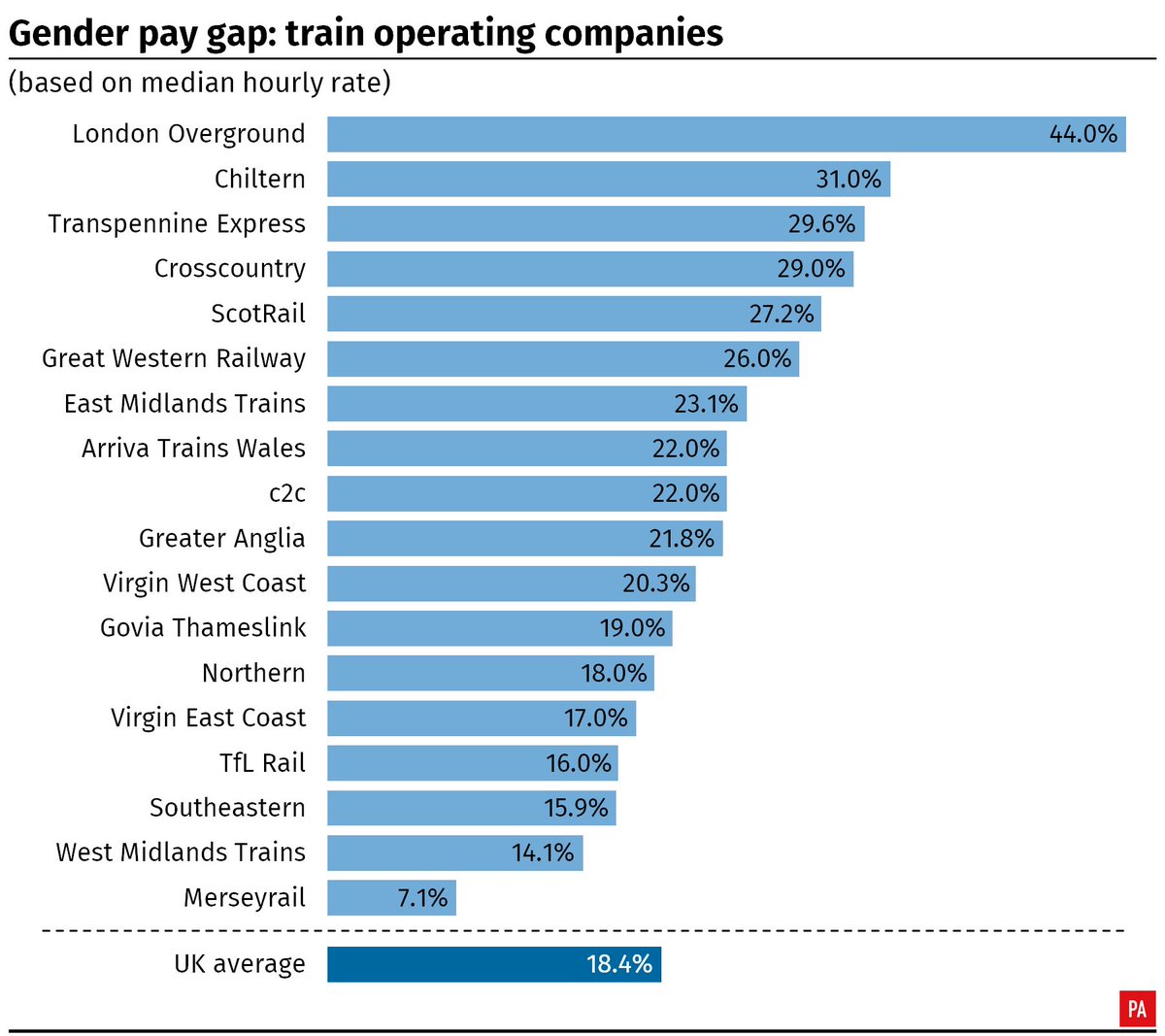 #GenderPayGap. All the main train operators have now published their figures, with London Overground reporting the biggest gap and Merseyrail the smallest.pic.twitter.com/uD5boqab93
