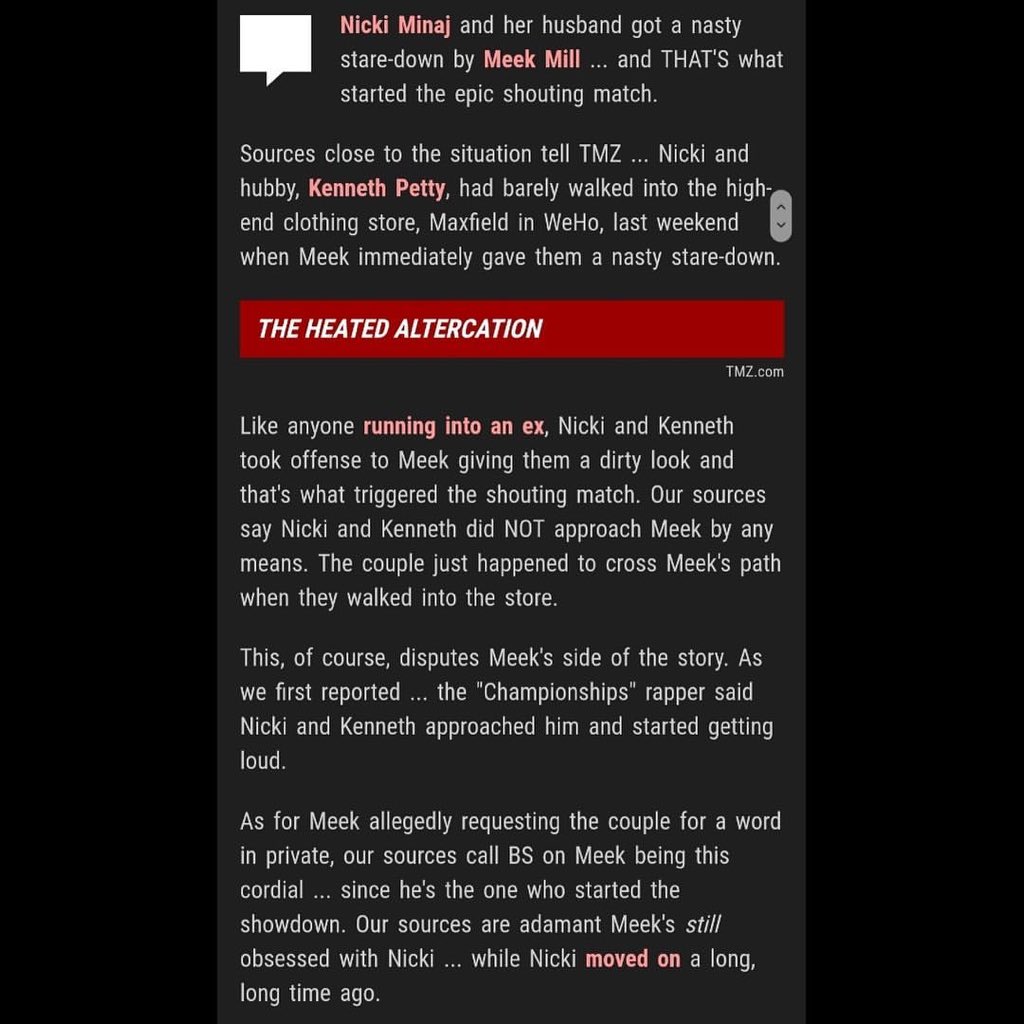 TMZ posts an update of the heated altercation between Nicki Minaj, her husband and Meek Mill at a clothing store, affirming that Meek is still obsessed with her.