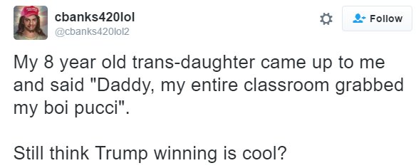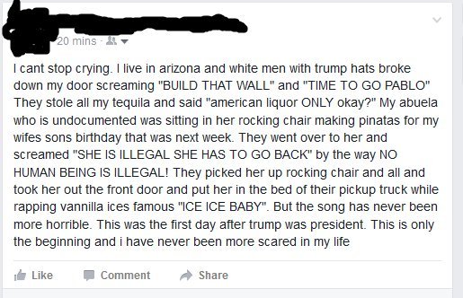 Again, you might want to put away the broad brushes there if you want us to as well.https://www.splcenter.org/hatewatch/2016/11/11/over-200-incidents-hateful-harassment-and-intimidation-election-day …