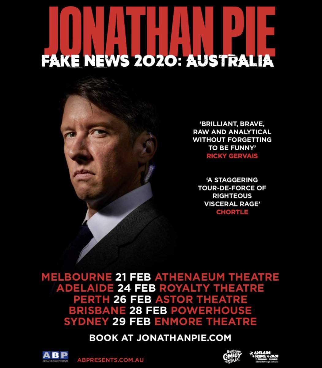 Watch out AUSTRALIA, I'm comin' to get ya! Tickets are selling fast: http://JonathanPie.com pic.twitter.com/PXUFM36Tie
