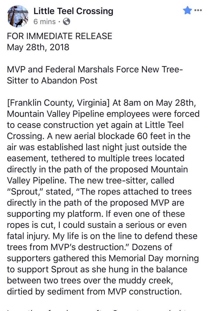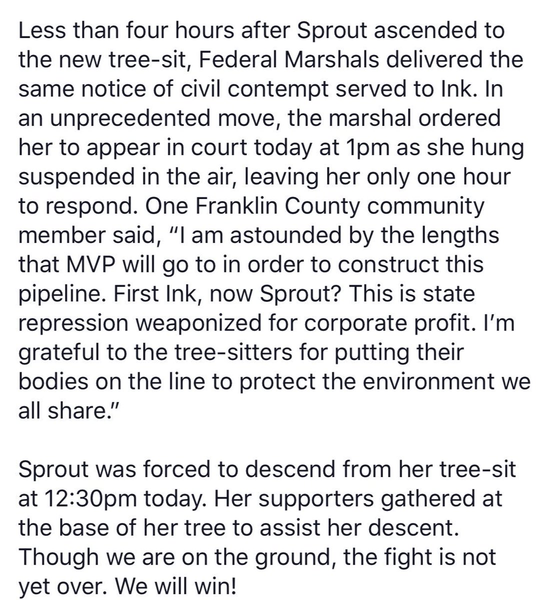 BREAKING: In unprecedented move, #NoMVP tree sitter, Sprout, served with notice of civil contempt after just FOUR HOURS and was forced to abandon her tree by Federal Marshals. More: https://www.facebook.com/LittleTeelCrossing/posts/969566476544955 …pic.twitter.com/HQCXyZe1UY