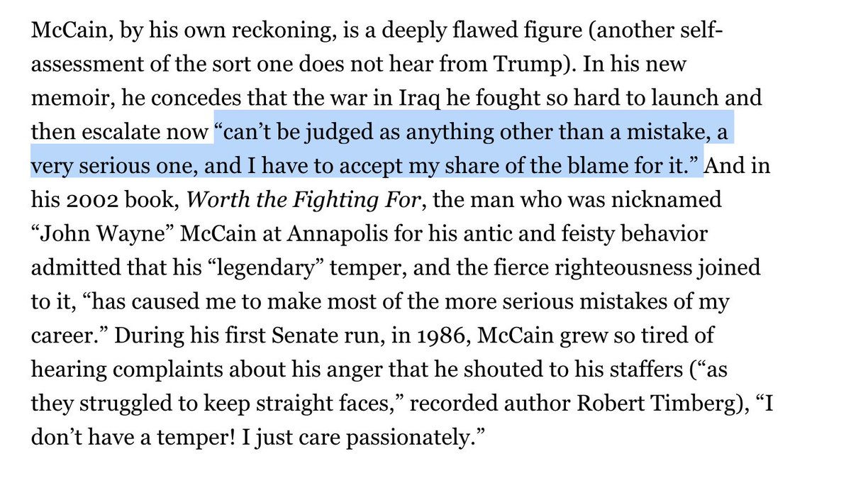 I’ve read The Restless Wave and unless I’m misremembering, he wrote that the Iraq invasion was a mistake but stood by his calls for the surge (i.e. escalation) as a necessary step to try to get the situation under control.