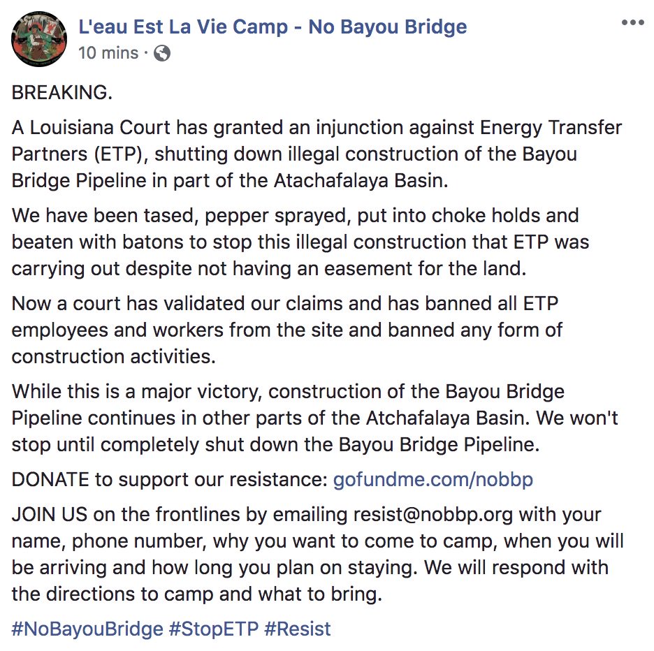 #BREAKING: Statement from Water Protectors Resistance Camp on the injunction partially stopping construction of Bayou Bridge Pipeline #NoBayouBridge #StopETPpic.twitter.com/9Wu9aXlroG