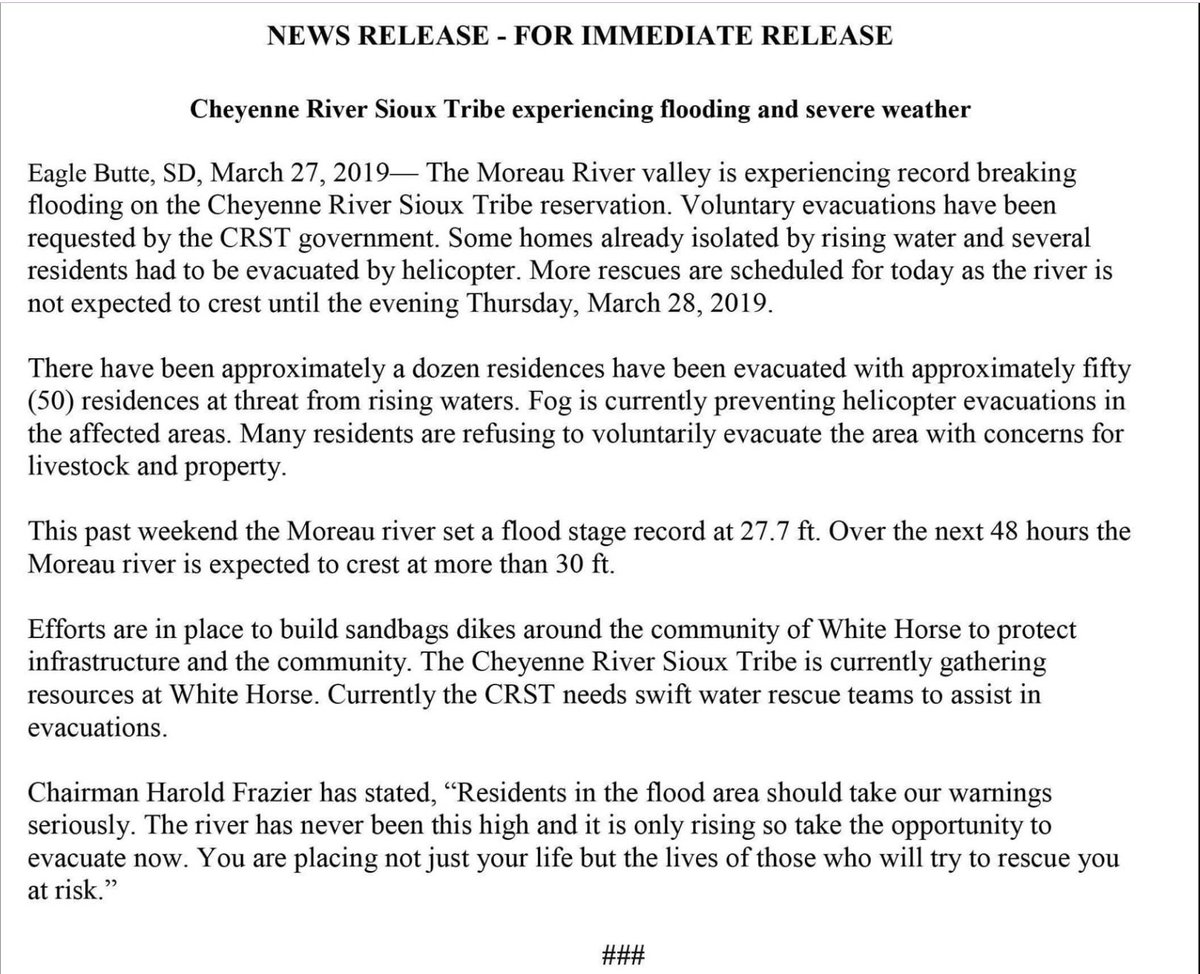 CLIMATE EMERGENCY: Cheyenne River Sioux Tribe Reservation Currently Has Voluntary Evacuations Underway Due to Flooding.pic.twitter.com/vEOKohNNFv