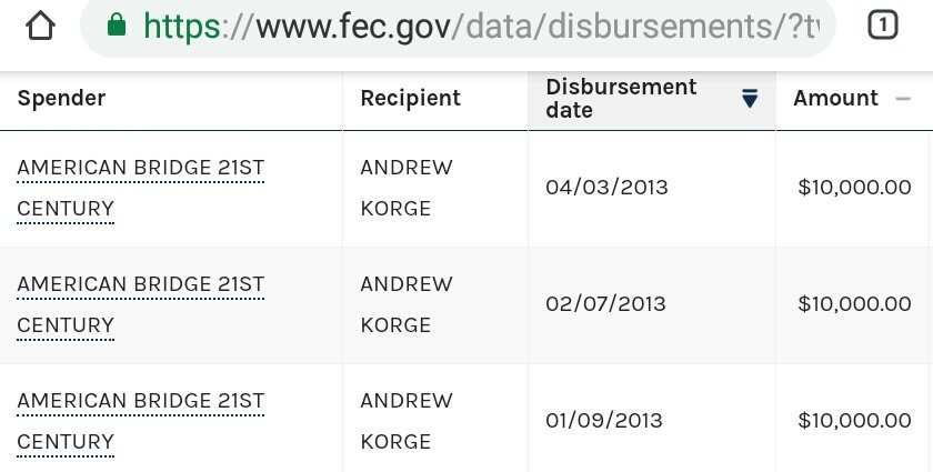 Andrew Korge, Chris's son accepts $10s of $1,000s from George Soros funded American Bridge 21st Century as seen in FEC filings.pic.twitter.com/LryRh6R5eL