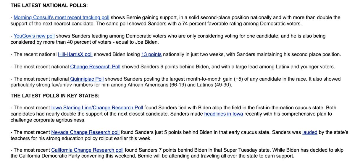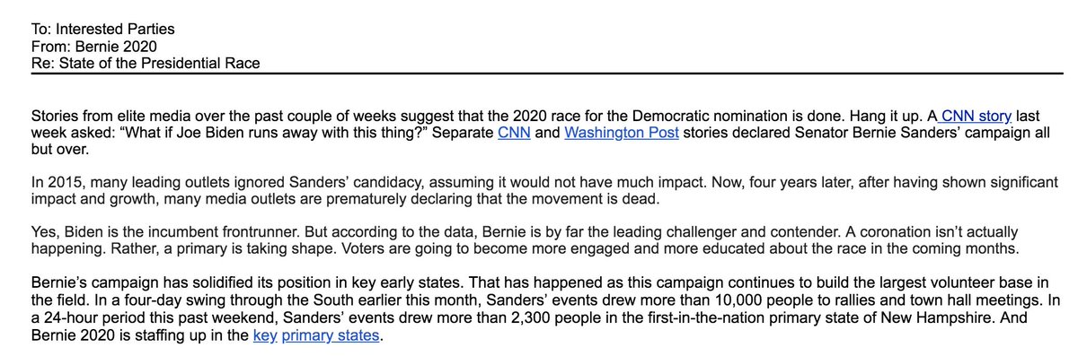 .@BernieSanders THREAD: Sanders campaign will be sending out the following memo to reporters 2da but @StatusCoup obtained early. The memo points out the "elite media" pushing stories depicting the 2020 race all-but over and "What if @JoeBiden runs away with this thing?”pic.twitter.com/6HV3qBIadV