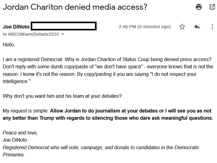 able to practice actual journalism at the debate. I ask all of you who would like to see us go down to Miami (as of now we will probably refund our plane/hotel tickets) to send NBC News your thoughts on them denying us credentials....DAILY. NBCUMiamiDebate2020@nbcuni.com.