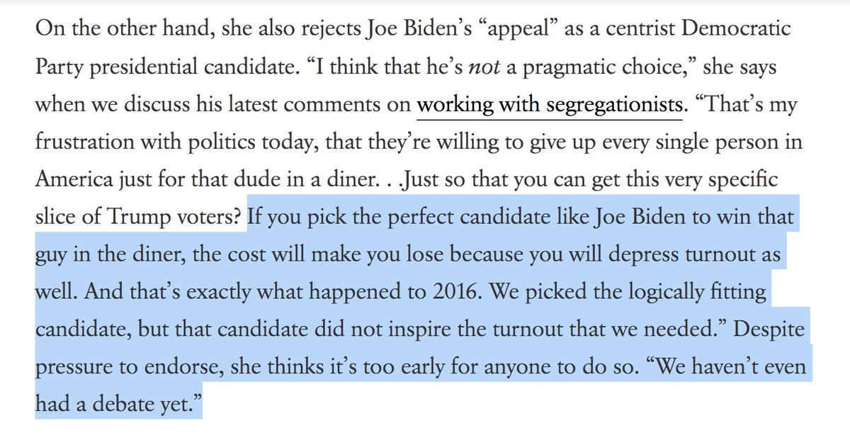 On @JoeBiden, @AOC says he might get the guy in the diner....but he'll depress turnout https://www.vogue.com/article/36-hours-with-alexandria-ocasio-cortez-primary-anniversary …pic.twitter.com/ki1ABsX1gU