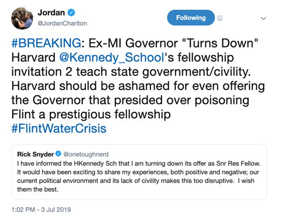 So rich, these "lack of civility" claims, from the man who oversaw the poisoning of children, the impacts of which are only beginning to be understood (h/t @prisonculture):
