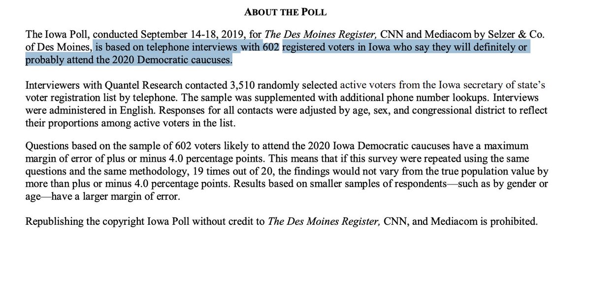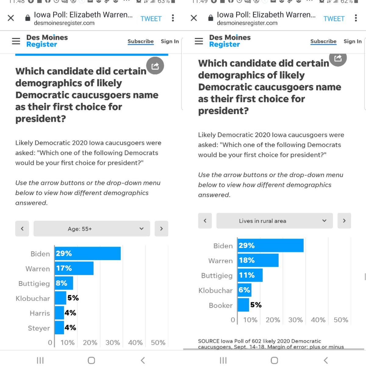 Also find it hella strange that the article offers this breakdown of percentages, but not the official poll PDF document at the end. (Unless I missed something)https://www.desmoinesregister.com/story/news/politics/iowa-poll/2019/09/22/iowa-poll-election-2020-iowa-caucus-elizabeth-warren-joe-biden-bernie-sanders-democrat-candidates/2370015001/ …