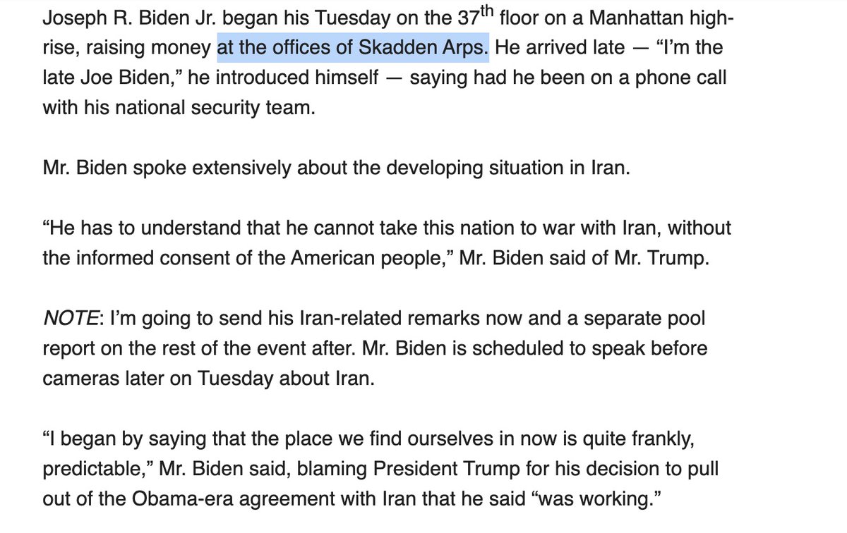 This morning, middle class @JoeBiden held fundraiser w/ giant Wall Street law firm Skadden Arps-- who's represented champions of the working class like -DuPont (poisoned many communities) -Pfizer (bribery in 8 counties) -JP Morgan/Bank of America (helped tank global economy)pic.twitter.com/GGbDpyDNnN