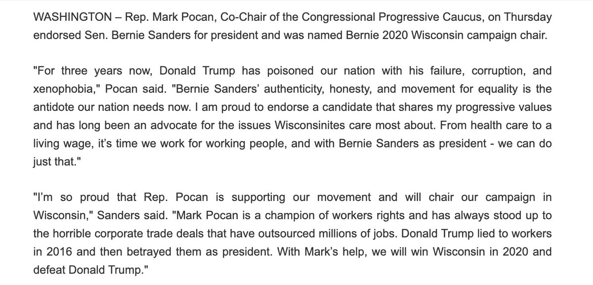 NEW: Congressional Progressive Caucus Co-Chair @MarkPocan Endorses @BernieSanderspic.twitter.com/lU2aZINvKX