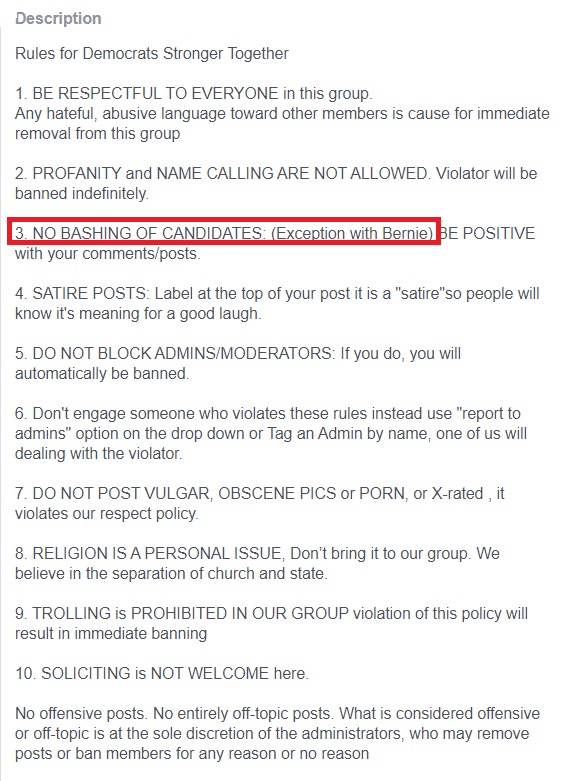 What's silly about these stories fixating on "mean" @BernieSanders supporters online is there are TONS of #Resistance establishment groups who proudly bash candidates. Here's a private Facebook group w/ 53,000 members. NO BASHING OF CANDIDATES (Exception with Bernie)pic.twitter.com/Wtq4V63rXo