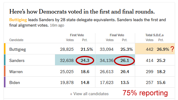 #IowaCaucus numbers & % show#Bernie2020 with higher 1st & Final votes and percent, yet they are giving lead to Buttigieg.#DNCFuckerypic.twitter.com/A0Z1Lm0VGS