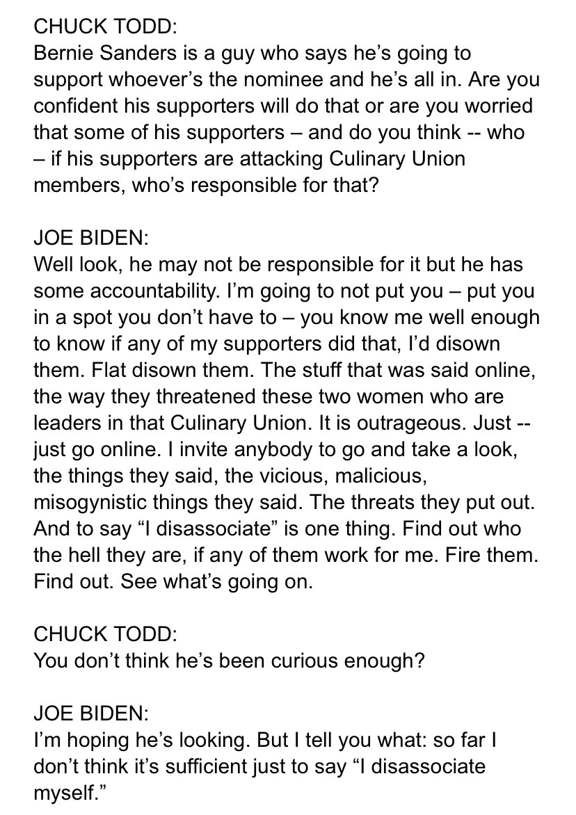 In interview with @MeetThePress, BIDEN says that SANDERS should take some accountability for his supporters’ rhetoric / attacks on Culinary Union members: “He may not be responsible for it but he has some accountability … if any of my supporters did that, I’d disown them.” pic.twitter.com/2Kc5EkQnDl