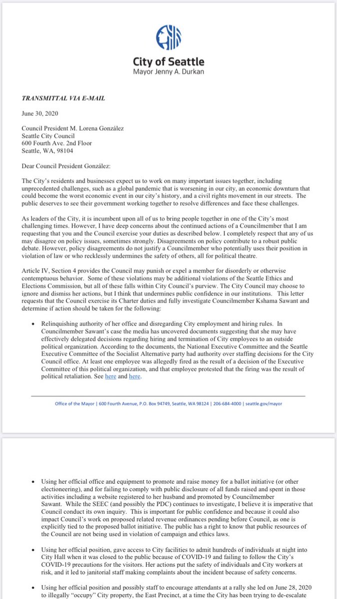 "BREAKING: #Seattle Mayor Jenny Durkan’s office confirms she is asking council to ‘punish or expel’ Councilmember Ks… https://twitter.com/i/web/status/1278026968135380992 …" -jwhittenbergK5pic.twitter.com/r7jtZeQkMr