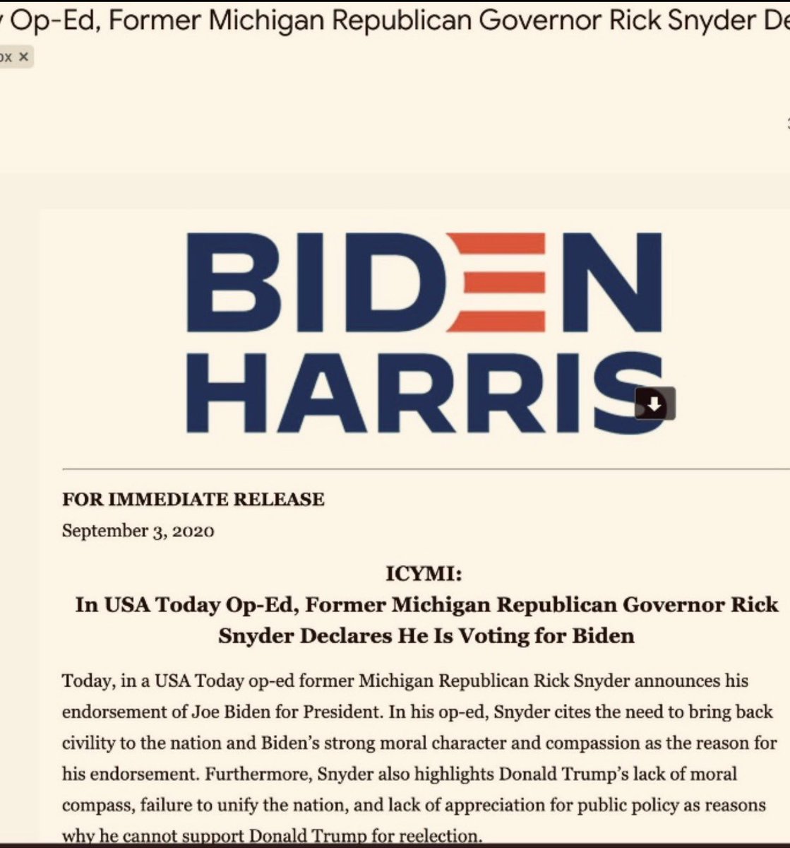 The Biden campaign, in an effort to convince Flint voters to stay home on Nov 3 and lose Michigan again, happily announced & embraced the endorsement of former Gov. Rick Snyder — the man who poisoned Flint’s water. 10,000 children w/ permanent brain damage. Countless dead. Shame! https://twitter.com/JordanChariton/status/1250822331938811904 …pic.twitter.com/XV6IwhbZxA
