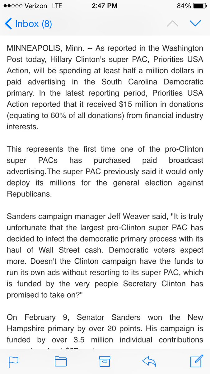 .@BernieSanders camp email: "Clinton Wall Street-Funded Super PAC Enters Democratic Primary Against Sanders"pic.twitter.com/gQVoOaKwjh