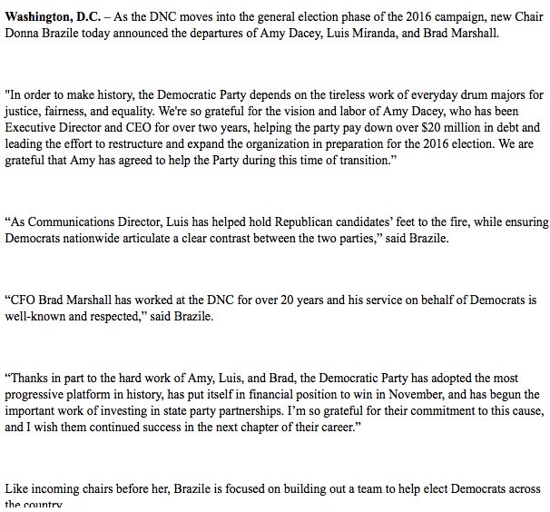 Just so they can install a bunch of NEW DNC goons. They probably are all moving over to the HRC campaign like DWS did!