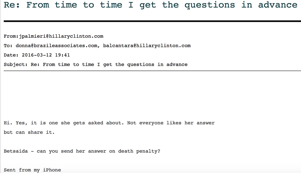 While still @CNN contributor, @DonnaBrazile tipped off @HillaryClinton 2 @CNN town hall death penalty question day b4 #Podestaemails3pic.twitter.com/rzYtOM7kKc
