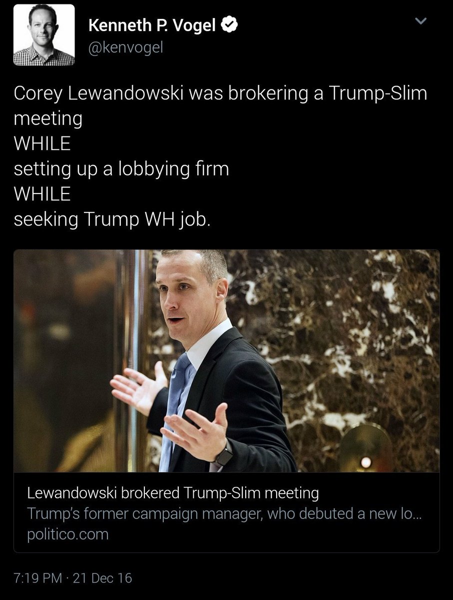 Corey Lewandowski was brokering a Trump-Slim meeting WHILE setting up a lobbying firm WHILE seeking Trump WH job. http://www.politico.com/story/2016/12/lewandowski-trump-carlos-slim-232905 …