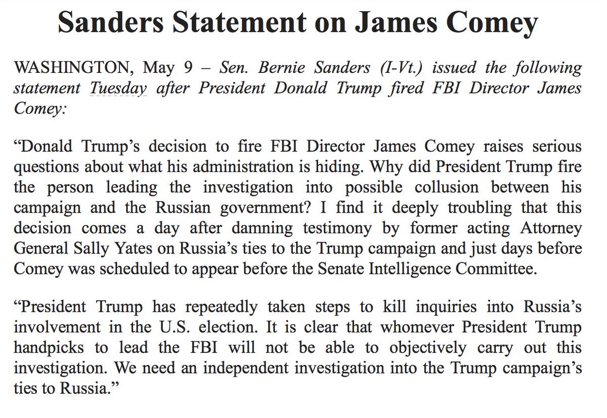 Even Bernie jumps on Bandwagons - and fails to use reason/logic at times. This is one. Comey firing NO IMPACT on FBI Investigation Itself.