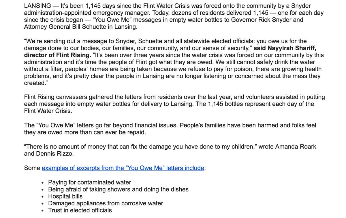 #BREAKING: Dozens of Flint residents delivering 1,145 “You Owe Me” letters to Governor @onetoughnerd Snyder 3 years into #FlintWaterCrisispic.twitter.com/JTQXDRQNvs