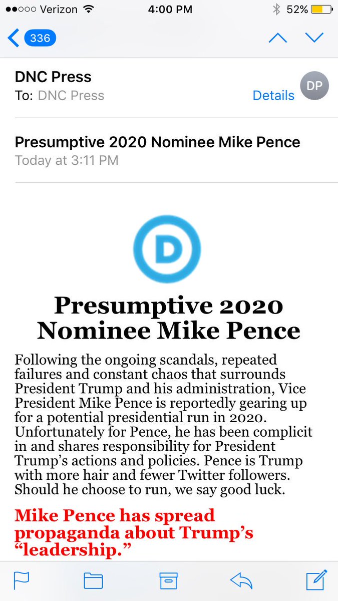 LOL at first glance I assumed this was referring to Pence as the presumed 2020 Democratic nominee...