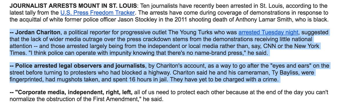 .@Politico's Media email by @mlcalderone features my account of my/others arrest. Protests continued last night #STLVerdict #Stlprotestspic.twitter.com/Eu9X7kSrfk