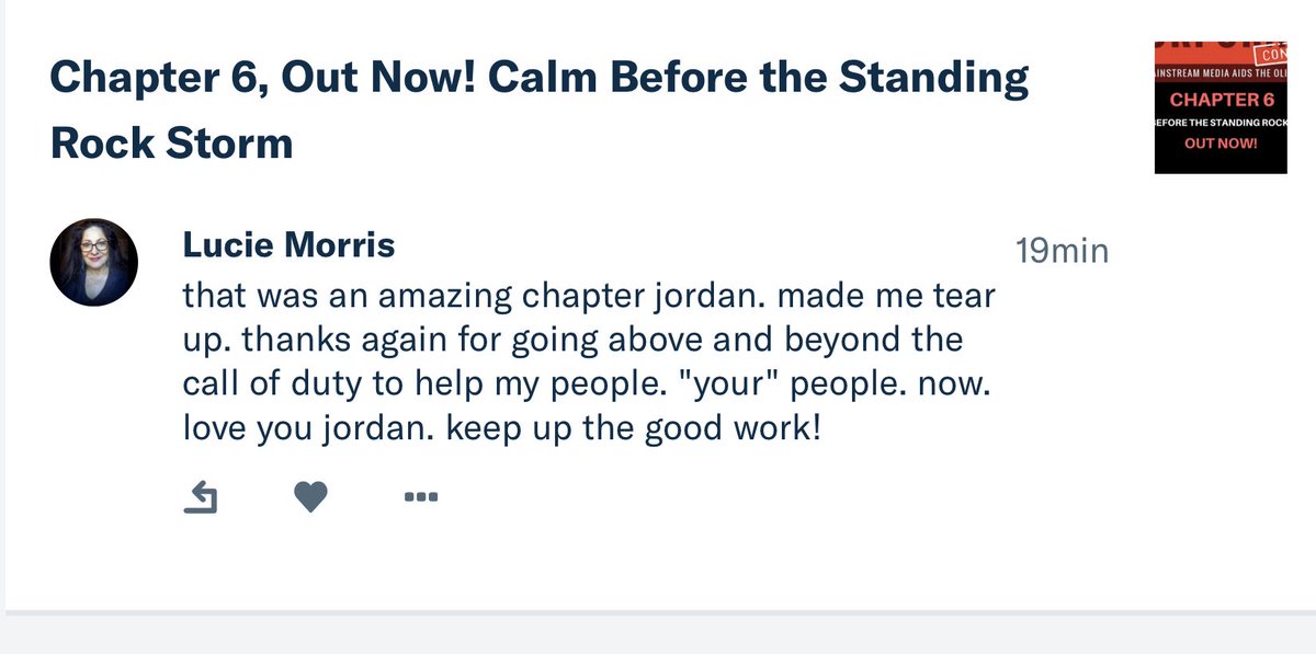 Wanted 2 share this kind comment from 1 of my #CorporateConJob Patrons (w/ her permission) on the "Calm Before the Standing Rock Storm" Chapter 6 I just released. Responses like this make writing worth it! SUBSCRIBE to read all 6 chapters released so far. https://bit.ly/2EYtuen pic.twitter.com/t4JsjgpFO9